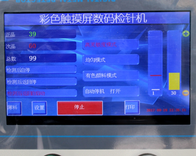 彩色觸屏式檢針機,采用7寸觸屏控制,中英文操作菜單,具有三種常用檢針機功能:高靈敏度模式、均勻型模式、有色顏料模式。適合多種產品檢針作業!