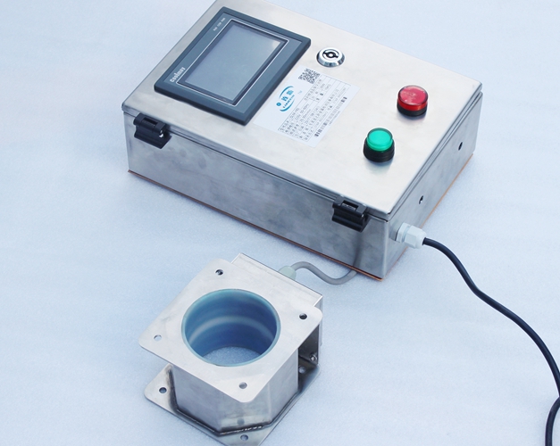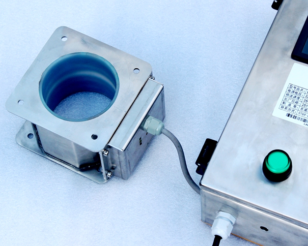 原料從料斗或送料器自由下落進入金屬分離器,如果沒有金屬雜質,原料會直接通過金屬分離器流向下端的出料口。如果檢測器檢測到原料中含有金屬,那么控制器立刻啟動分離板將金屬物和部分原料一起導向側面的排料口,然后分流板迅速恢復至正常的位置,分流板速度可調,金屬分離器的檢測精度也可根據生產需要調節,最小可檢測并分離出Φ 0.2mm的金屬顆粒。